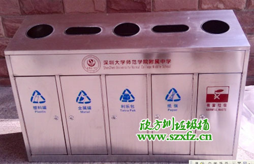 深圳師范學院附屬中學款式的C170五分類環保回收箱規格為:1600*400*860mm.外表是一款全新不銹鋼材質打造而成.不銹鋼垃圾桶頂部有五個垃圾投放組合,圓形垃圾投口分別左,右,中間,還有兩個半圓在中間部位。不銹鋼垃圾桶正面開有五個門,每一個門前都有一個小鑰匙配套開門。正面中間橫幅有LOGO的標準,還有深圳大學師范學院附屬中學字樣及英文拼音字母組合而成。不銹鋼垃圾桶五個取放垃圾內膽正門,絲印有五個垃圾投放標志。從左到右依次回收塑料罐,金屬罐,利樂包,紙張,有害垃圾及標志。不銹鋼垃圾桶外觀為方形,具有獨特的堅固耐用,不易破損;耐火安全,抗高低溫等優勢。適合各大院校,高檔場所使用。