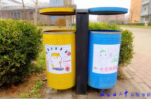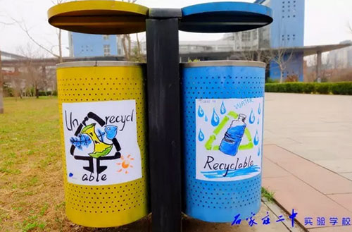 2016年3月18日,石家莊二中實(shí)驗(yàn)學(xué)校2015級(jí)高一11班全體66名同學(xué)利用班級(jí)值周的時(shí)間,手繪百幅垃圾分類標(biāo)志,為校園垃圾桶換上了“新裝”。18日上午,高一11班教室內(nèi),66位同學(xué)拿起五顏六色的水彩筆,在紙張上設(shè)計(jì)出各種各樣的“垃圾分類”標(biāo)識(shí)和警示語,內(nèi)容涵蓋了分類標(biāo)志、垃圾擬人、科普漫畫等,圖面生動(dòng)有趣。次日下午,同學(xué)們又從教室奔向校園每個(gè)角落,將精心繪制的圖案張貼在校內(nèi)所有的垃圾桶上,提醒過往師生將垃圾分類,維護(hù)我們共同的家園。