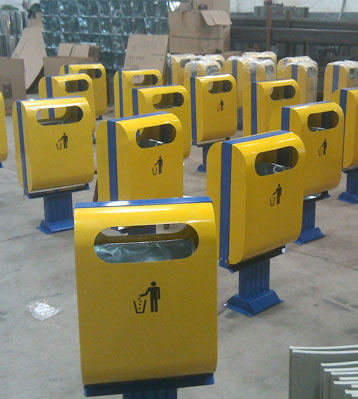 • 產品材質:欣方圳社區戶外鋼制垃圾桶采用優質冷軋鋼材料經剪鈑下料、折彎、沖壓、焊接、打磨、等工藝:表面經過除油、噴砂防銹處理后,再進行酸洗磷化處理;表面清理干燥后整體進行靜電噴涂或烤漆處理,靜電噴涂是經過流水線高溫固化爐固化后再出爐冷卻,加工后的塑粉附著力強,不易剝落;